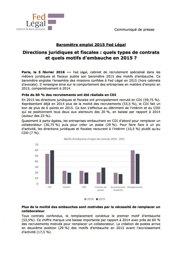 Directions juridiques et fiscales : quels types de contrats et quels motifs d’embauche en 2015 ? 2016, Communiqués de presse, Groupe FEDPar Corinne5 février 2016Voir et télécharger le PDF