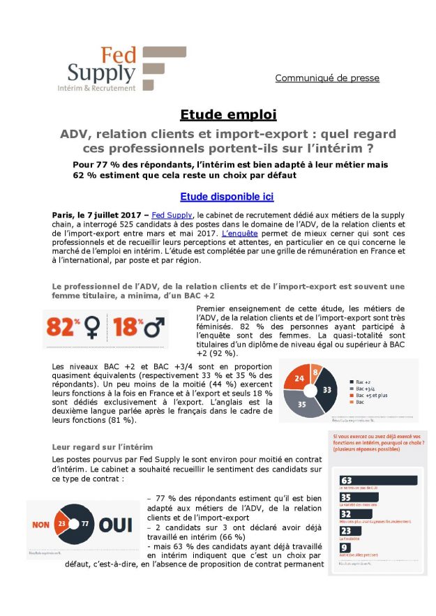 Etude emploi ADV, relation clients et import-export : quel regard ces professionnels portent-ils sur l’intérim ? 2017, Communiqués de presse, Groupe FEDPar Corinne7 juillet 2017Voir et télécharger le PDF