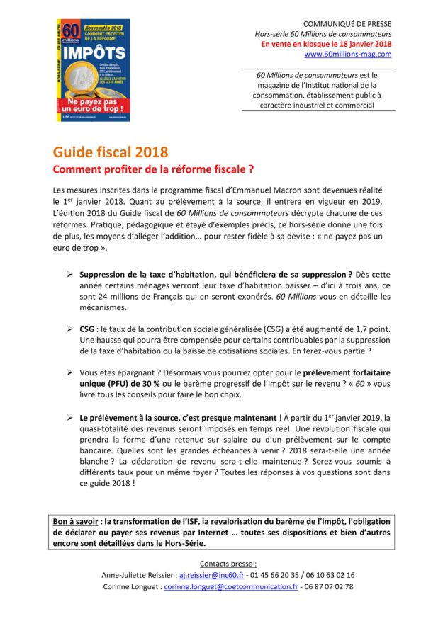 Guide fiscal 2018 / Comment profiter de la réforme fiscale ? 2018, 60 Millions de consommateurs, Communiqués de pressePar Corinne18 janvier 2018 Voir et télécharger le PDF