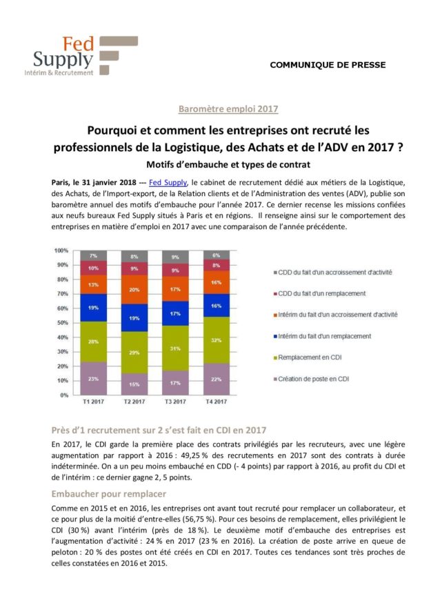 Pourquoi et comment les entreprises ont recruté les professionnels de la Logistique, des Achats et de l’ADV en 2017 ? 2018, Communiqués de presse, Groupe FEDPar Corinne31 janvier 2018Voir et télécharger le PDF