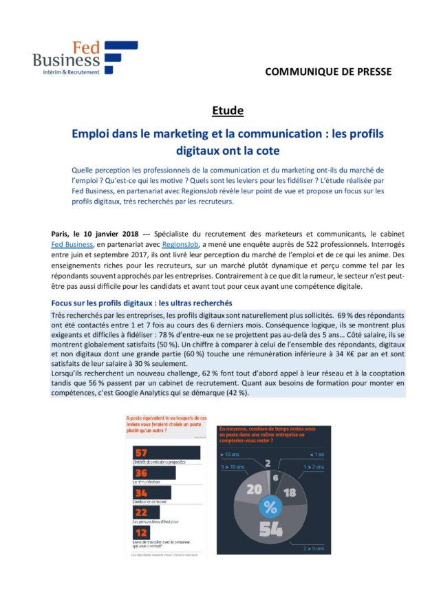 Emploi dans le marketing et la communication : les profils digitaux ont la cote 2018, Communiqués de presse, Groupe FEDPar Corinne10 janvier 2018Voir et télécharger le PDF