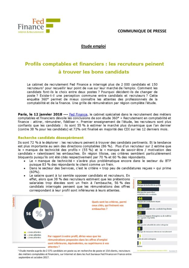 Profils comptables et financiers : les recruteurs peinent à trouver les bons candidats 2018, Communiqués de presse, Groupe FEDPar Corinne12 janvier 2018Voir et télécharger le PDF