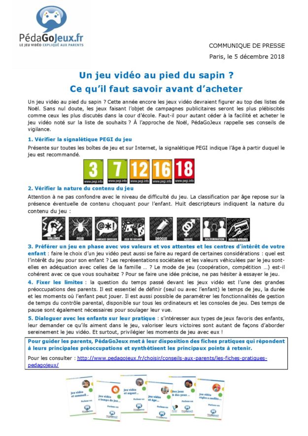 Un jeu vidéo au pied du sapin ? Ce qu’il faut savoir avant d’acheter 2018, Communiqués de presse, PédaGoJeuxPar Corinne5 décembre 2018Voir et télécharger le PDF