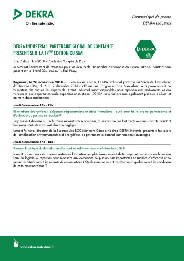 DEKRA INDUSTRIAL, PARTENAIRE GLOBAL DE CONFIANCE, PRESENT SUR LA 17ÈME ÉDITION DU SIMI 2018, Communiqués de presse, DekraPar Corinne5 décembre 2018Voir et télécharger le PDF