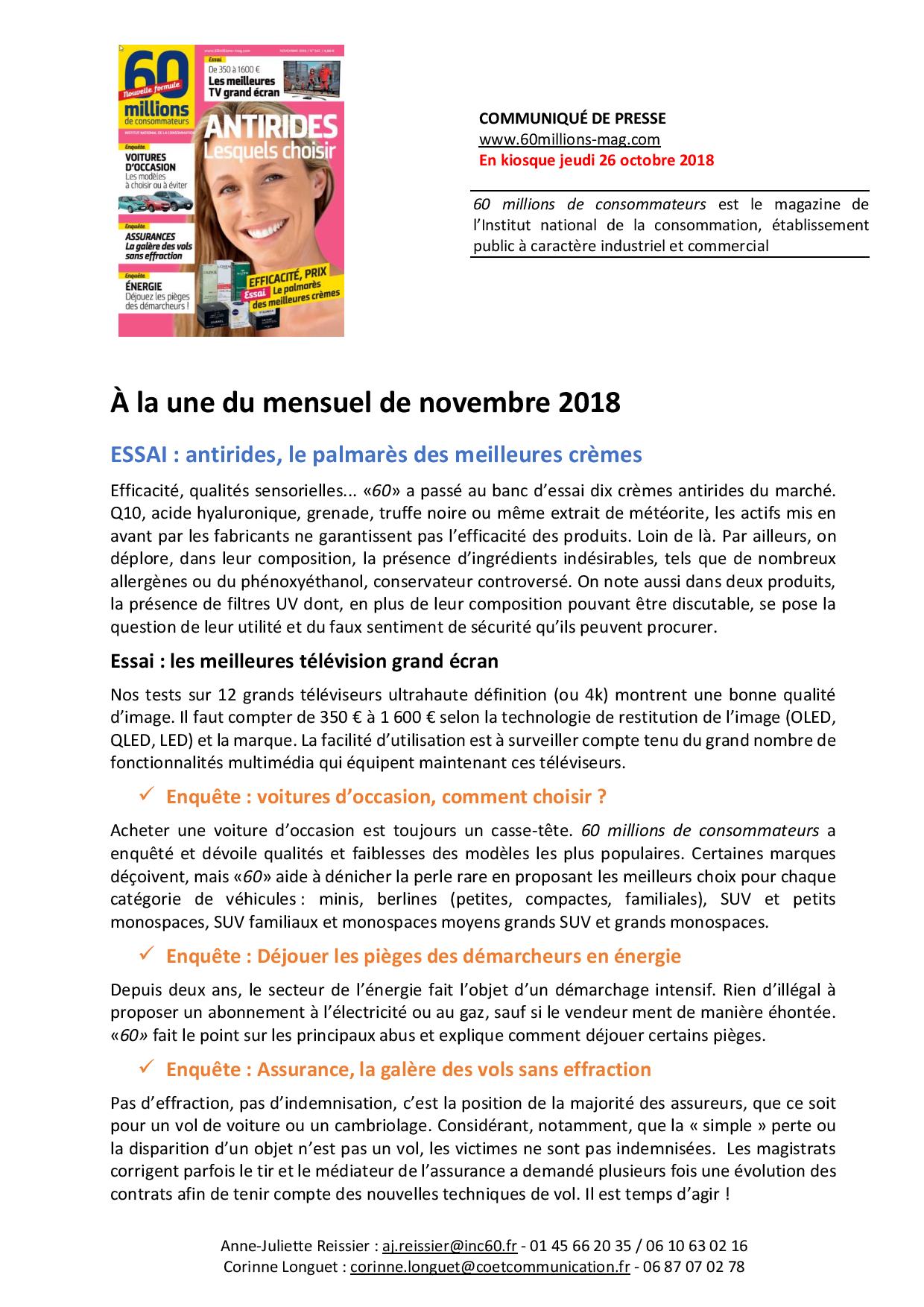 Catégorie  2018, 60 Millions de consommateurs, Communiqués de presse29 octobre 2018