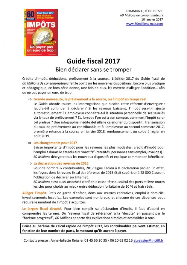 Hors-Série : Guide fiscal 2017 : Bien déclarer sans se tromper 2017, 60 Millions de consommateurs, Communiqués de pressePar Corinne10 janvier 2017Voir et télécharger le PDF