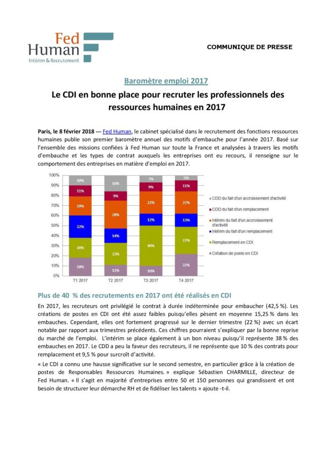 Baromètre Fed Human 2017 : Le CDI en bonne place pour recruter les professionnels des ressources humaines en 2017 2018, Communiqués de presse, Groupe FEDPar Corinne8 février 2018Voir et télécharger le PDF