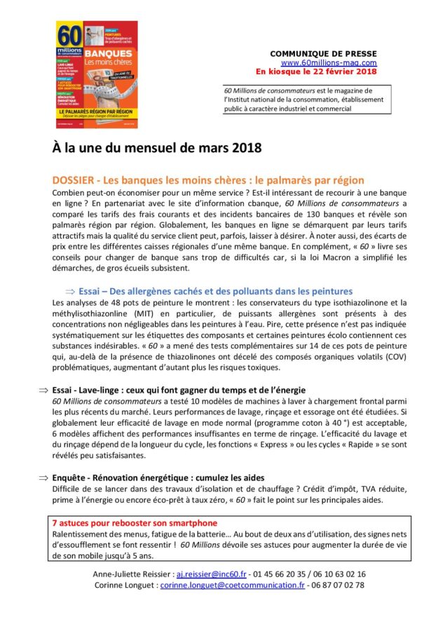 À la une du mensuel de mars 2018 2018, 60 Millions de consommateurs, Communiqués de pressePar Corinne22 février 2018Voir et télécharger le PDF
