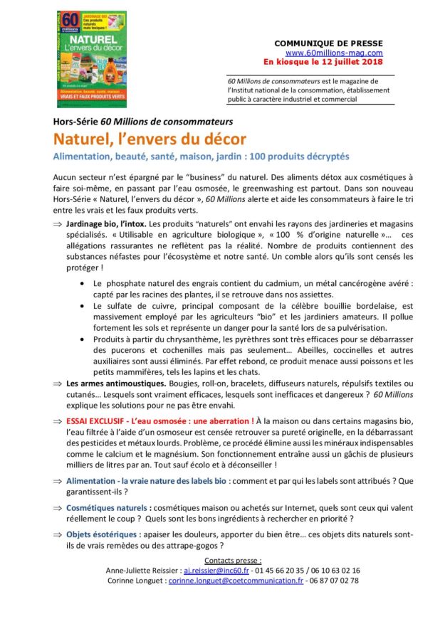 Naturel, l’envers du décor Alimentation, beauté, santé, maison, jardin : 100 produits décryptés 2018, 60 Millions de consommateurs, Communiqués de pressePar Corinne12 juillet 2018Voir et télécharger le PDF