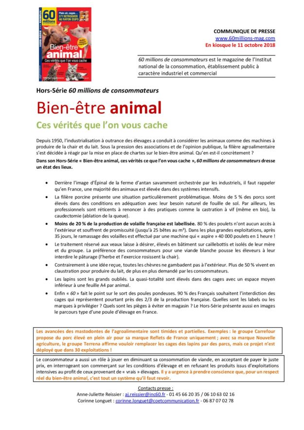 Hors-Série 60 millions de consommateurs : Bien-être animal 2018, 60 Millions de consommateurs, Communiqués de pressePar Corinne11 octobre 2018 Voir et télécharger le PDF