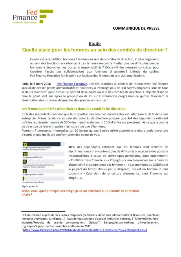 Quelle place pour les femmes au sein des comités de direction ? 2018, Communiqués de presse, Groupe FEDPar Corinne8 mars 2018Voir et télécharger le PDF