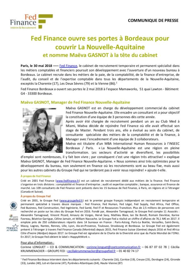 Fed Finance ouvre ses portes à Bordeaux pour couvrir La Nouvelle-Aquitaine et nomme Maëva GASNOT à la tête du cabinet 2018, Communiqués de presse, Groupe FEDPar Corinne30 mai 2018Voir et télécharger le PDF