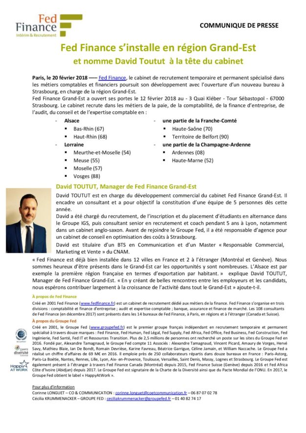 Fed Finance s’installe en région Grand-Est et nomme David Toutut à la tête du cabinet 2018, Communiqués de presse, Groupe FEDPar Corinne20 février 2018Voir et télécharger le PDF