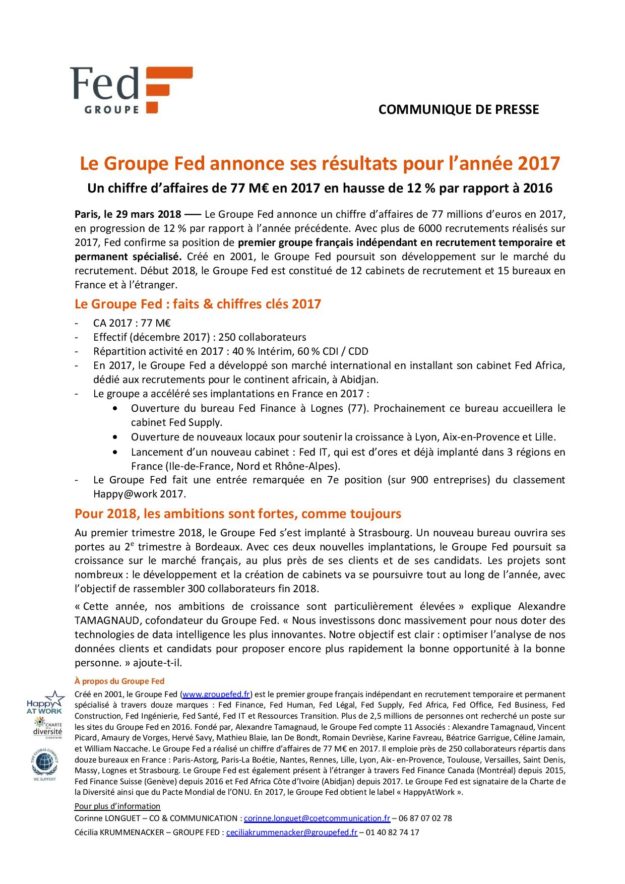 Le Groupe Fed annonce ses résultats pour l’année 2017 2018, Communiqués de presse, Groupe FEDPar Corinne29 mars 2018Voir et télécharger le PDF